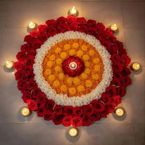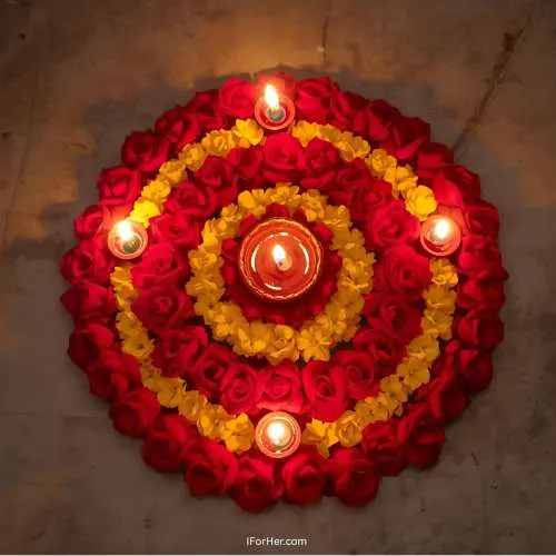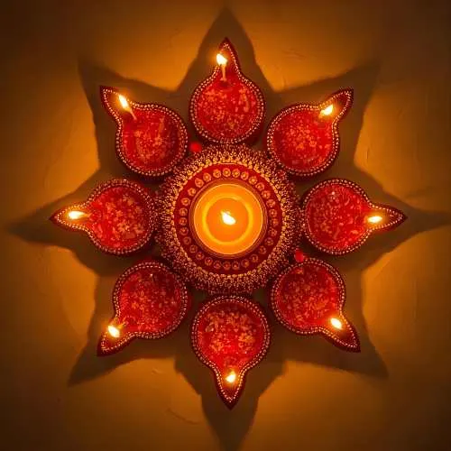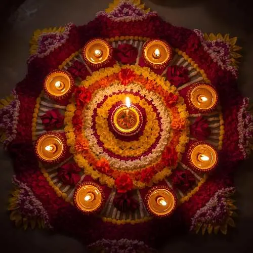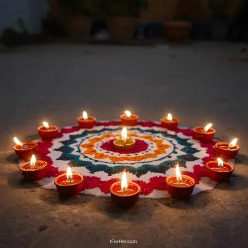 Diyas (oil lamps) are a symbol of light, hope, and purity. When placed around or within a rangoli, they enhance its beauty and spiritual meaning. The glow of diyas is believed to guide Goddess Lakshmi into the home, dispelling darkness and negativity. The combination of colorful rangoli and flickering diyas represents the perfect harmony of art, devotion, and celebration – spreading light, love, and positivity all around.