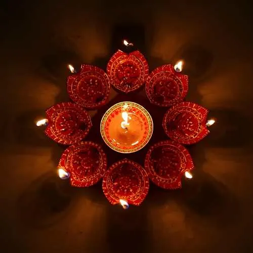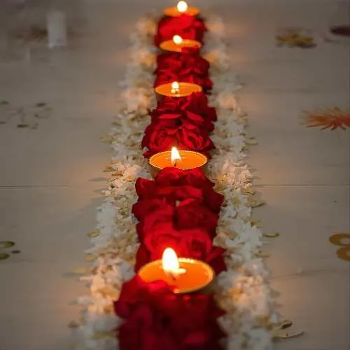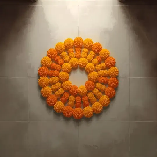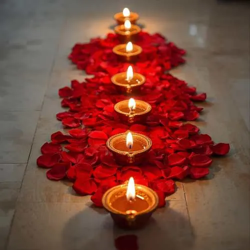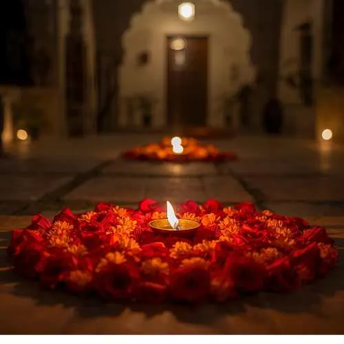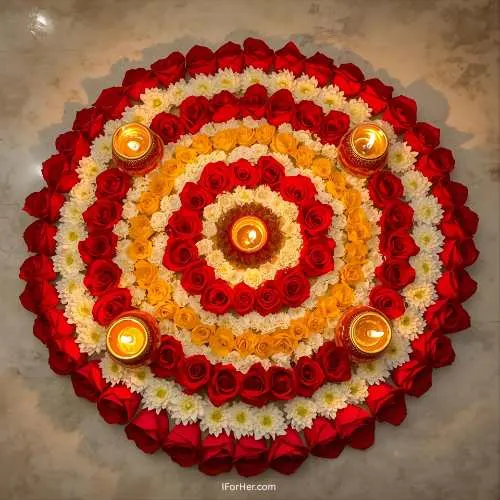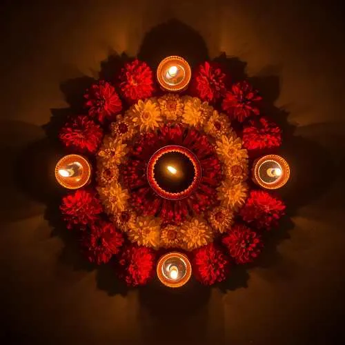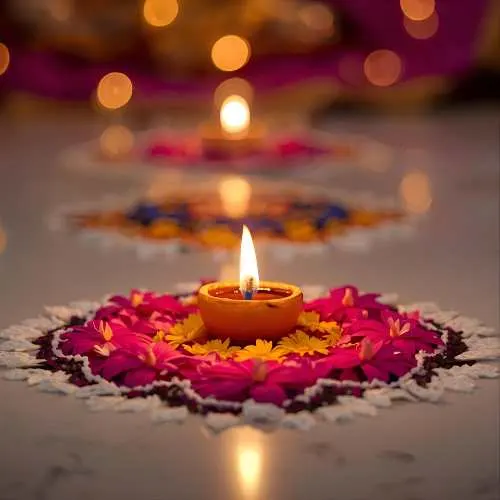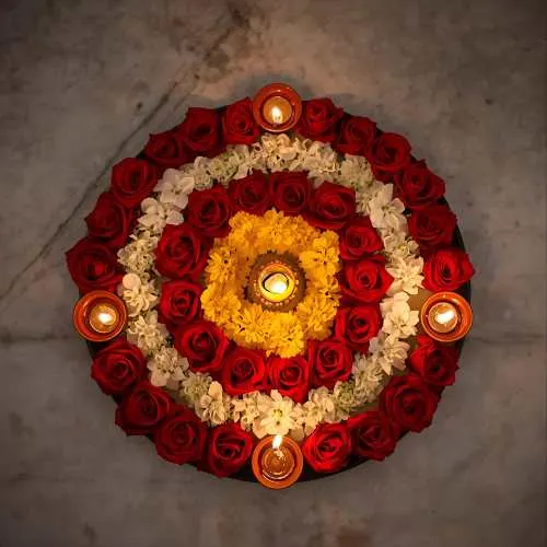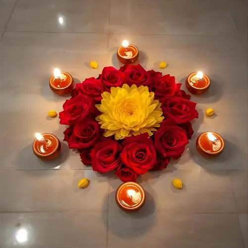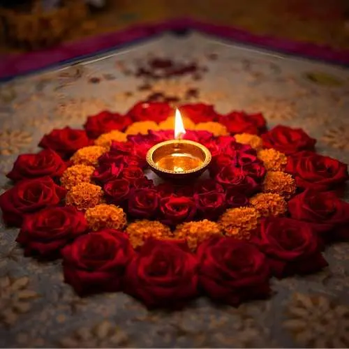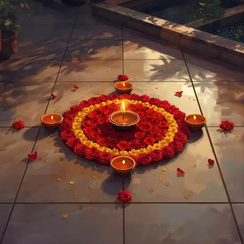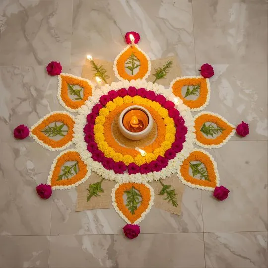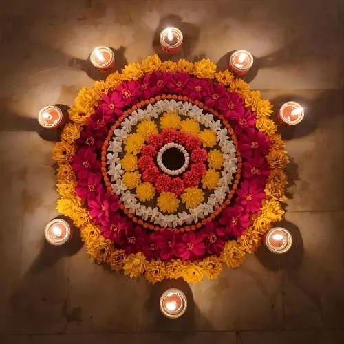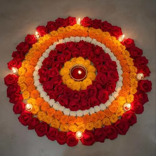 Rangoli isn’t limited to just colored powders – a variety of materials can be used to create stunning designs. Traditional kolam or rice flour patterns are popular in South India, while diyas, flower petals, and even colored sand add vibrant textures and a festive glow. Each design can feature different motifs, from the graceful peacock and intricate geometric patterns to religious symbols like Goddess Lakshmi for prosperity or Lord Ganesha for good fortune. Using these diverse materials and motifs not only makes the rangoli visually striking but also deeply meaningful, blending artistry with tradition in every creation.