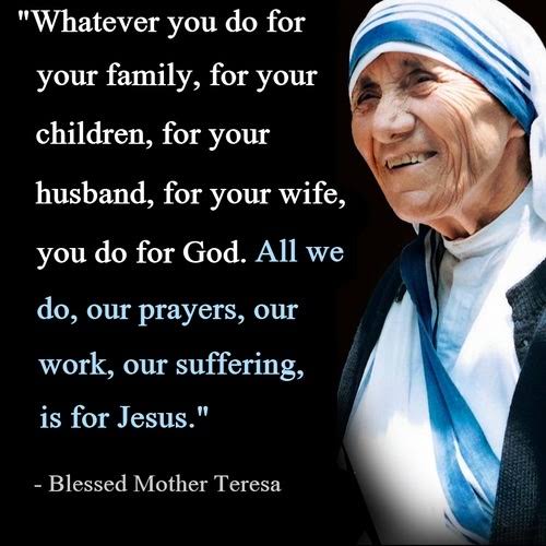 “I am not sure exactly what heaven will be like, but I know that when we die and it comes time for God to judge us, he will not ask, ‘How many good things have you done in your life?’ rather he will ask, ‘How much love did you put into what you did?” ~Mother Teresa